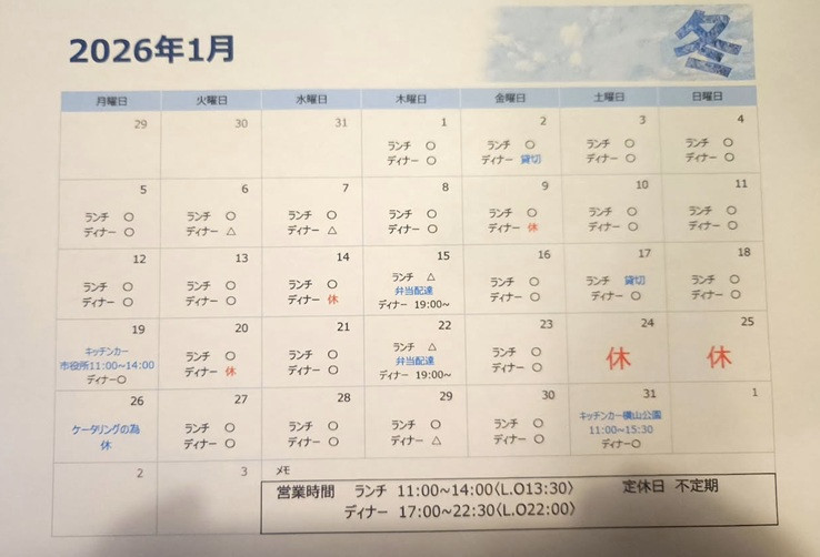 2026年1月営業カレンダー
